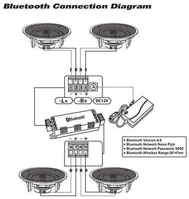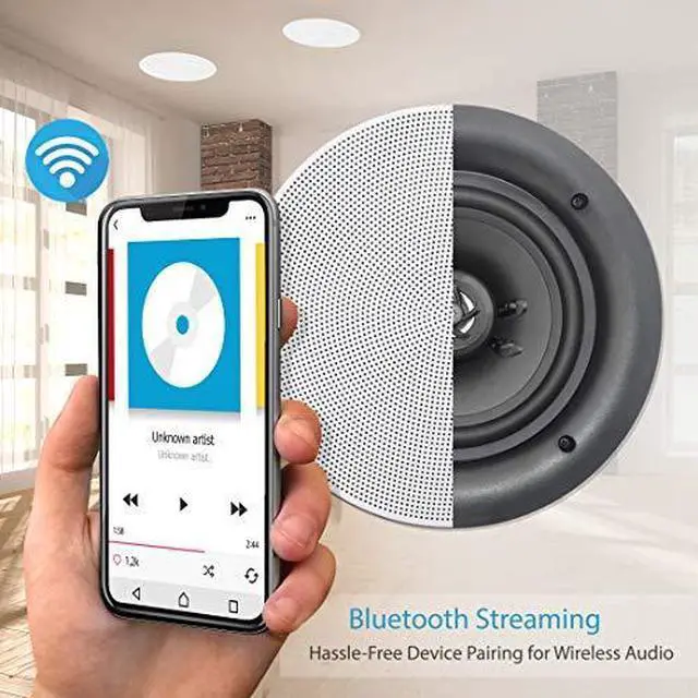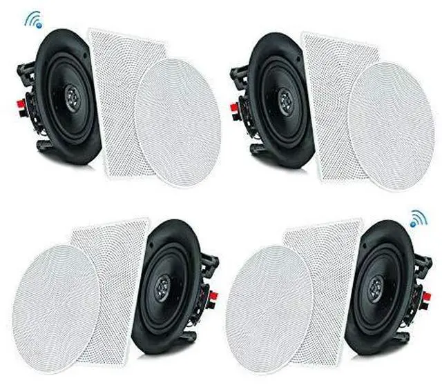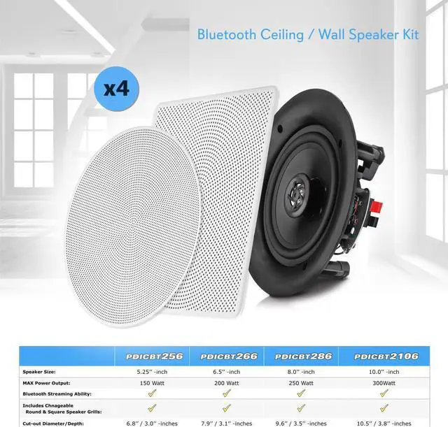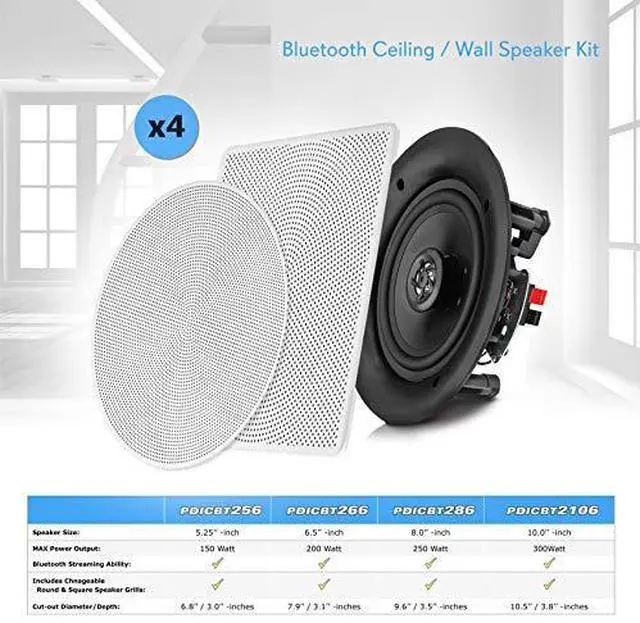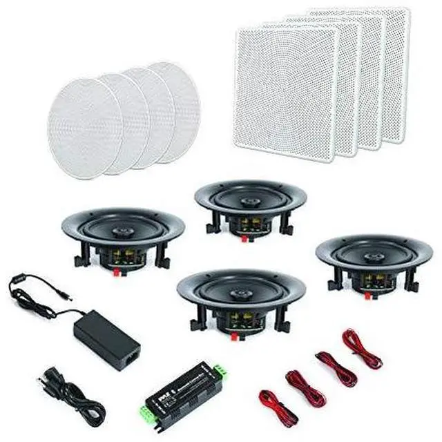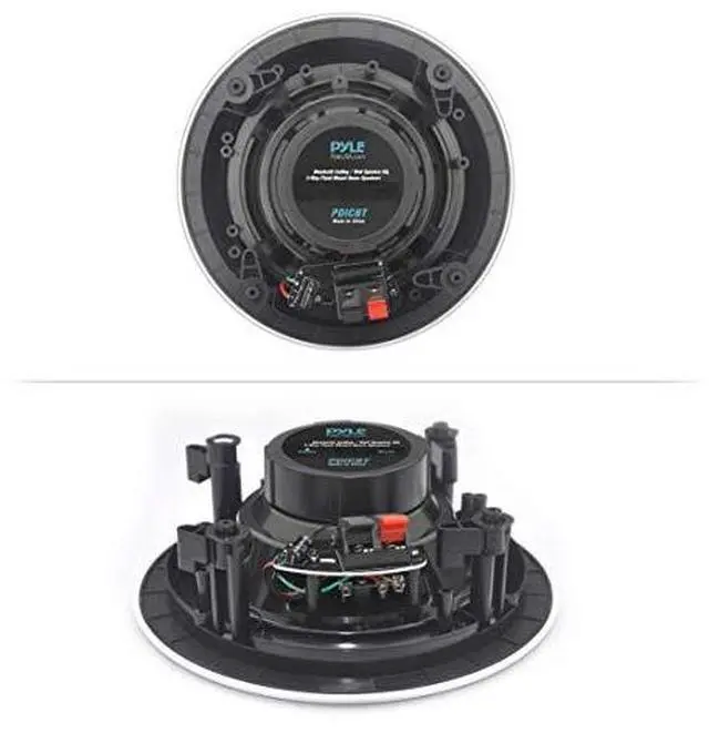 The Pyle In-Wall/Ceiling Bluetooth Speaker Kit delivers effortless stereo sound to any room in your home or office. The included Bluetooth controller allows for wireless music streaming ability and doubles as a sound processing digital amplifier. You will be able to stream audio from all of your favorite devices (like smartphones, tablets and computers). Each speaker features a high-compliance polymer tweeter that delivers full, rich sound without cluttering floor space. They are made of environmentally friendly ABS material and include changeable round and square grills. Spring-loaded speaker terminals make for quick connection and the system comes with a cut-out template for easy installation. Mount them in a convenient location on the wall or ceiling for a flush, clean look. Achieve wide-range sound performance and add audio to any room with the Pyle In-Wall/Ceiling Bluetooth Speaker Kit.