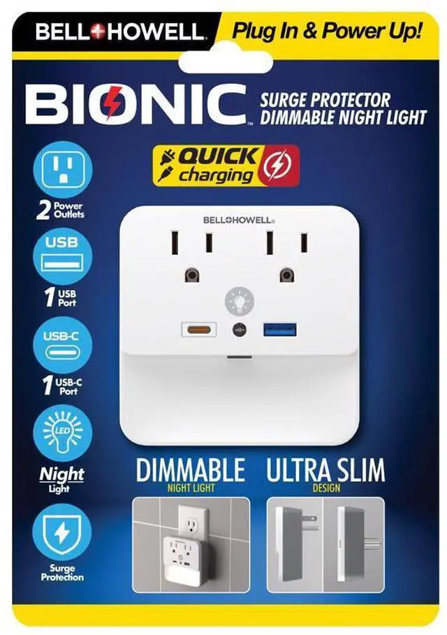 Grade Residential Material Plastic Nema Type Non NEMA Number in Package 1 Packaging Type Plug Type Grounding Product Type Plug with Night Light Sub Brand Bionic Wire Range Brand Name Bell Howell Color White Volts Poles Wires Amperage Connection Type Male Female Grounding UL CSA Listed Smart Enabled Built In WiFi
