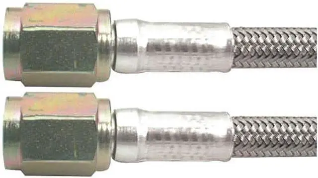 A wide selection of braided steel lines in various lengths. All lines come with one straight end and your choice of straight, 45?or 90?on the other end. The inner PTFE hose is compatible with all brake fluids. The braided stainless steel outer covering resists abrasion and corrosion. Ideal for use where bending and flexing occur. More durable than rubber hose. Lengths stated are overall end to end including fittings.