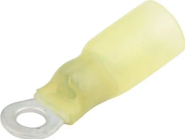 Ring Terminal, Heat Shrink, 12-10 Gauge Wire, Number 8 Hole, Tin Plated Copper / Plastic, Yellow, Set of 10 Crimp style connectors work great when building custom wire harnesses or making repairs to existing wiring. Tin plated copper terminals are available in a variety of types and sizes.