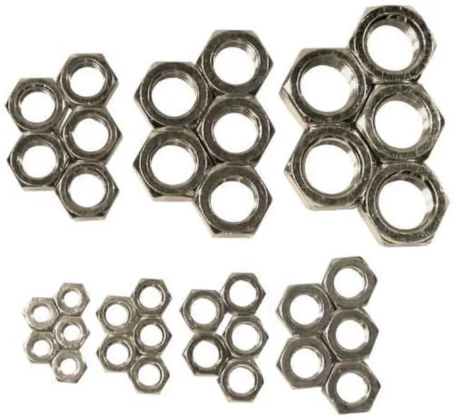 • Assortments contain five each of 1/4"-20, 5/16"-24, 3/8"-24, 7/16"-20, 1/2"-20, 5/8"-18 and 3/4"-16.