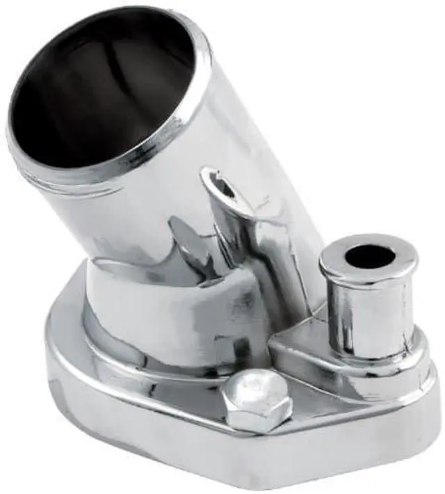 Cast aluminum 45 degree water neck fits small block Ford. Includes an O-ring for sealing the base flange and two hex head bolts.