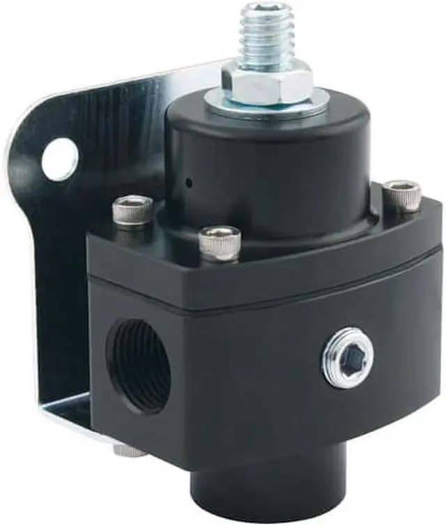 Place regulator between fuel pump and carburetor to regulate fuel pressure when using mechanical and electric performance fuel pumps. Two piece aluminum body has a single 3/8"NPT inlet port on the bottom and two3/8"NPT side outlet ports. "Dead Head" style regulator does not require a return line back to fuel tank or cell. 1/8" NPT port for mounting a fuel pressure gauge or sender line. Regulator also includes steel mounting bracket.