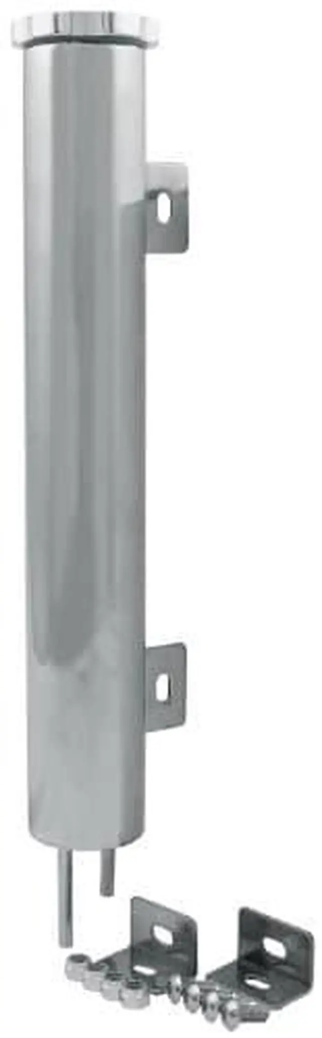 Stainless steel tanks capture coolant overflow and recirculates it to the radiator. Machined aluminum cap twists into the filler neck and seals with an O-ring. Inlet/outlet fittings accept 1/4" diameter hose. Unit includes mounting brackets and hardware. Measurements are of tank body; add 2" for overall length.