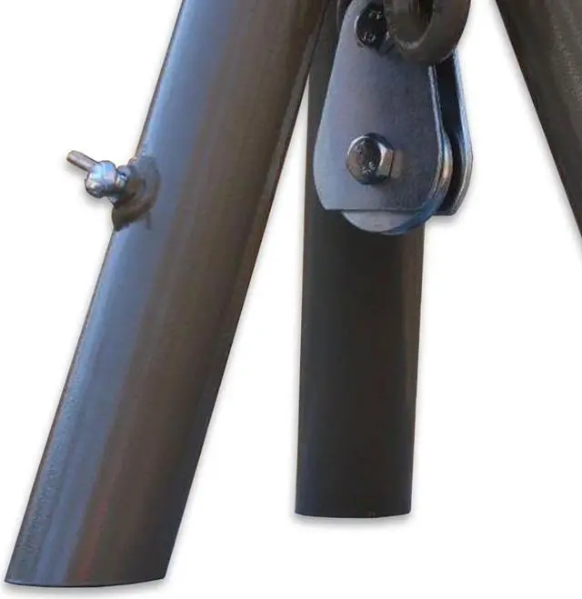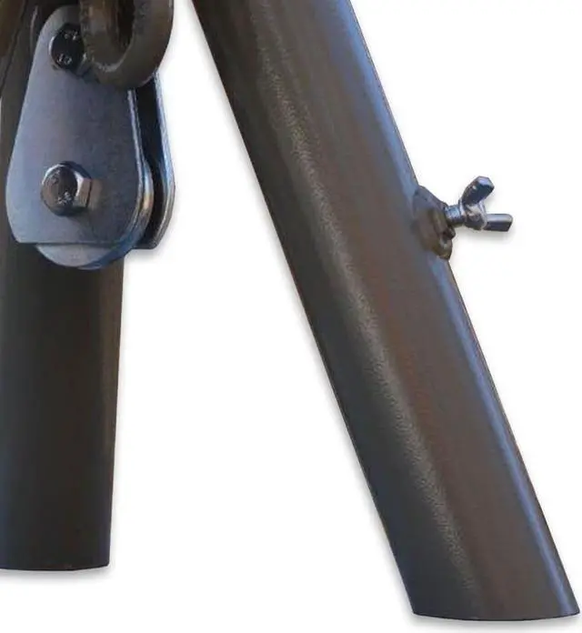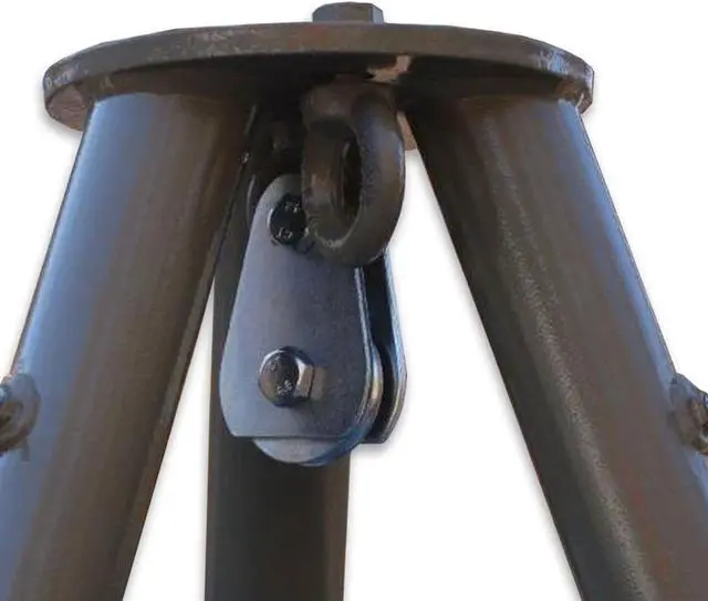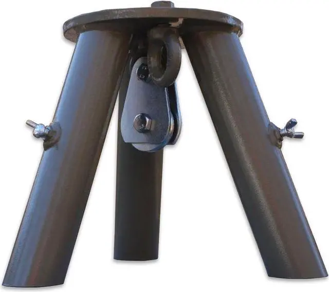 Accepts your 1 5 / 8 " pipe (or smaller) Heavy-duty pulley can handle big-time loads Each pipe leg is 9 1 / 2 " long Plate-steel top measures 6 x 6 1 / 2 "