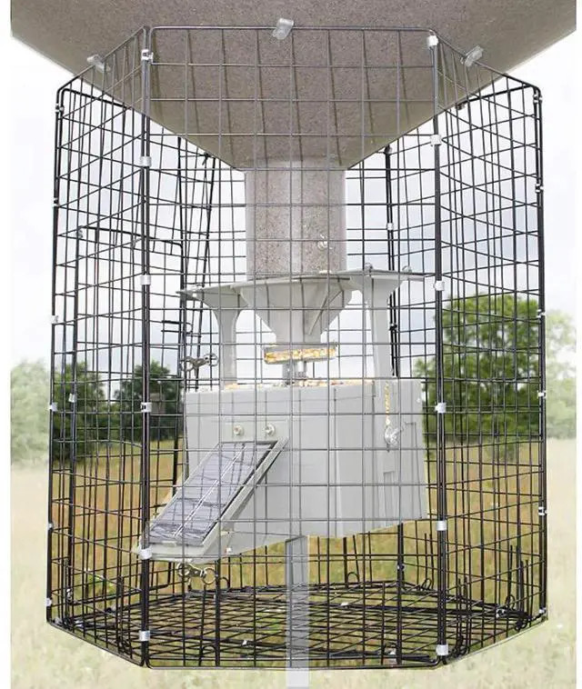 Heavy duty steel wire Large door opening for easy access Steel collars for strong hinges Can attach to older models with screws Allows solar panel (box mount) to fit inside (not included) Size: 24" x 26"