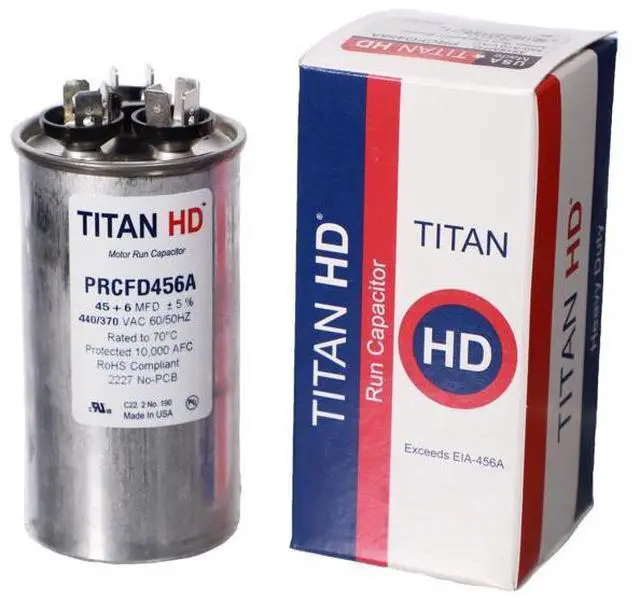 Brand Name Titan Pro Case Material Aluminum Depth 2 25 Height 4 5 Microfarads 45 6 MFD Model Compatibility Product Type Round Run Capacitor Sub Brand UL Listed Yes Volts 440 Width 2 25