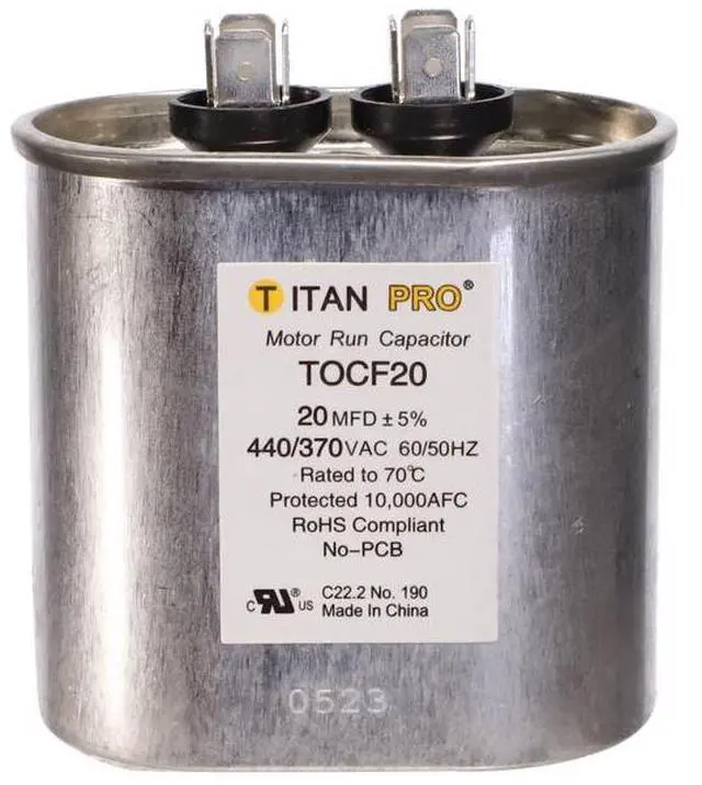Brand Name Titan Pro Case Material Aluminum Depth 1 77 Height 2 68 Microfarads 20 MFD Model Compatibility Product Type Oval Run Capacitor Sub Brand UL Listed Yes Volts 440 Width 2 8