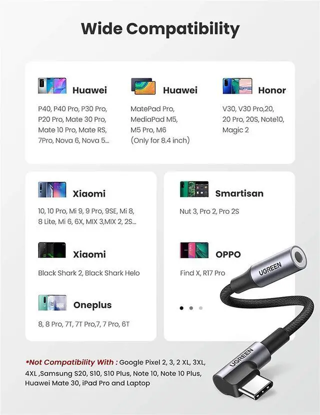 Previous Song Compatibility: Without built-in DAC chipset, UGREEN USB C to 3.5 mm Headphone Jack Adapter only supports the listed devices: Huawei P40/P40 Pro/P30 Pro/P20/P20 Pro/Mate20 Pro/Mate20 RS/Mate 10 Pro/Nova 7 Pro/Nova 6/Nova 5 Pro/Nova 5t//MediaPad M6 8.4" /MediaPad M5 8.4", OnePlus Nord/8/8 Pro/7T/7T Pro/7 Pro/7/6T, Xiaomi Mi 10 Pro/Mi 10/Mi 9/Mi 8/Mi 6, Honor 20 Pro/Note