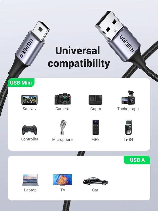 USB Cable: UGREEN USB 2.0 Type A to mini B cable connects your USB-ready computer or USB hub to a digital camera or other portable device with a mini B 5-pin connector, such as a dash cam, camera, Garmin GPS, MP3 player, game controller, PDA, GPS receiver Super-Speed Transfer and