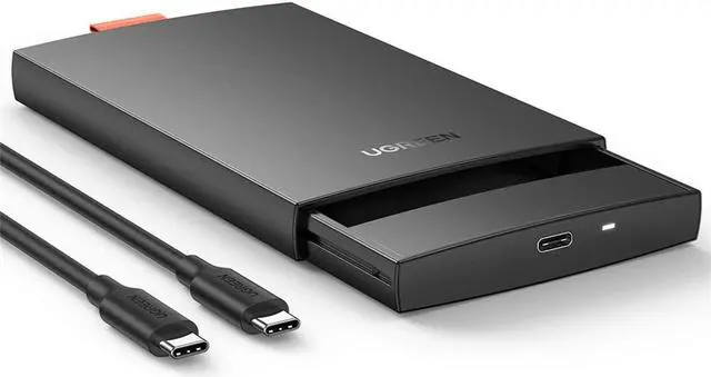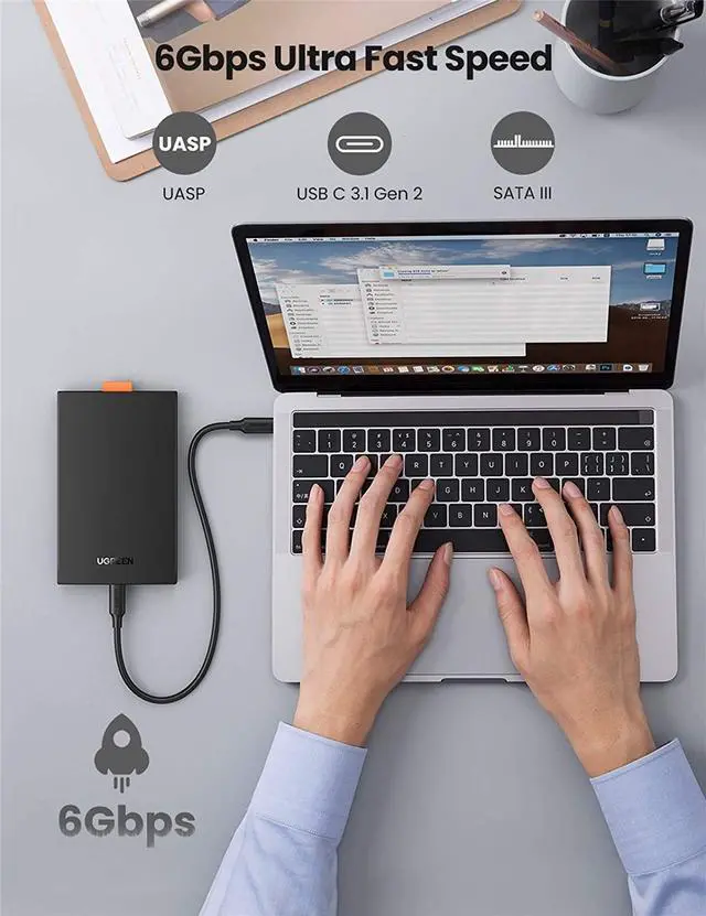 Speed with UASP: UGREEN USB C Hard Drive Enclosure supports 6Gbps max transfer speed and UASP accelerated transmission protocol, 70% Faster than traditional USB 3.0. The USB-C port is standard USB 3.1 Gen 2 which supports 10Gbps and (7+15)Pin SATA III supports max 6Gbps. 50cm USB-C to UAB-C Cable included