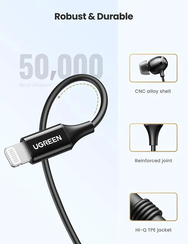 Exquisite Workmanship: The UGREEN Lightning headphone is designed from a lightweight material with silicone and metallic finishes. The modeling design conforms to the principle of ergonomics, which makes the earphones more comfortable than any other earbud-style headphones, don't need to worry about fall off when outdoor activities.