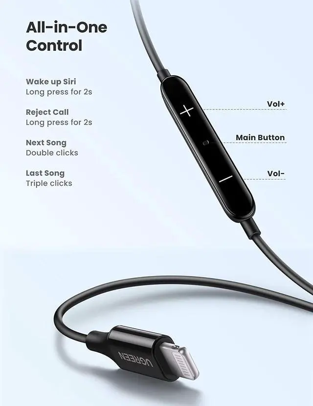 Microphone & Headphone Control: UGREEN Lightning wired earbuds features with premium Knowles MEMS microphone, efficiently reduce the noise, provides high sensitivity and high SNR output, offer a clear conversation, and record. The in-line button allows you to adjust the volume, take calls or change songs, wake up Siri, playback, and stop the music. Ensure the hands-free function without taking out your iPhone from the pocket.