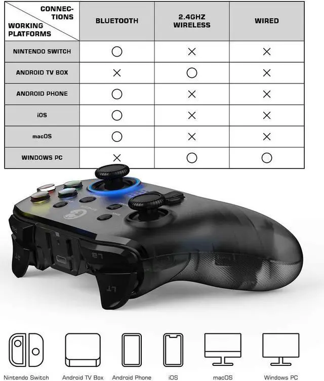 ?Universal Compatibility?T4 pro Wireless Game Controller Comes with Phone Bracket. It supports Android phones and tablets, Windows XP/ 7/8/10 ( Not Support Bluetooth Connection), macOS and Deeply Supports Apple Arcade, MFi Games, Switch Games. ?Semi-transparen Cover. RGB Backlighting?Semi-transparent cover specially treated with matte finish shows excellent contents. Stunning colorful LED backlight on ABXY buttons and right joystick glows even in the dark. Compared to the traditional controller, it is more cool! ?Dual Vibration. And Configurable Keys?Asymmetric vibrating motor with 5 speed levels enhances immersion in games. Provides real-time and realistic gaming experience.