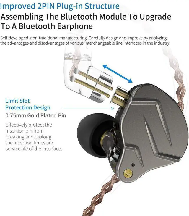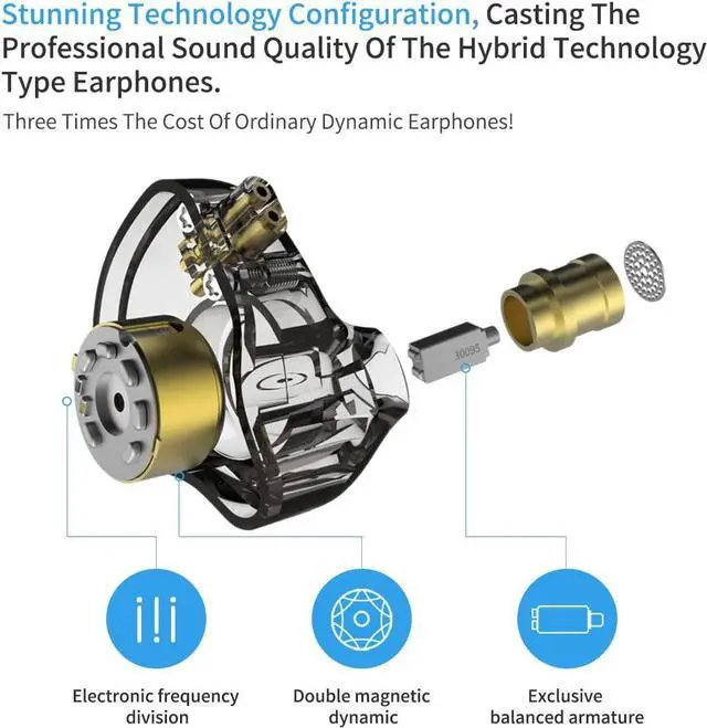 Professional Cable SchemeAnti-pull, anti-bending, anti-corrosion provides excellent sound quality signal transmission Independent patented silicone sleeveIt is more confortable to fit the human auricle and transmits sound directly to the eardrum, thus gaining a good sound quality experience New technology The size of the 10mm dynamic has the sound quality of the traditional 13-14mm dynamic The customized 30095 balanced armature unit, for your sensitive performance of broader hige-frequency resolution Precision metal processing technology creates strong and durable works of art.