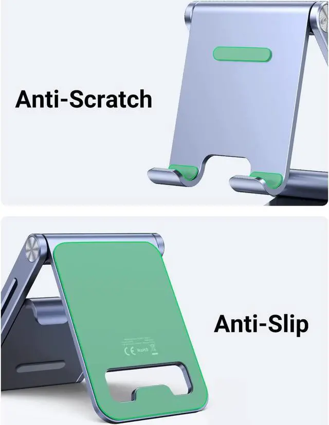 Bottom: This cell phone stand with rubber padding on the bottom, the stand will not slide around on a desk, the double-axis design also keeps the phone from sliding around in the stand itself, no danger of falling. And There is rubber padding on the holder part to protect your phone from scratch and slip Easy to