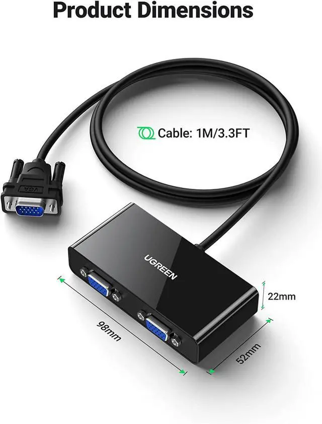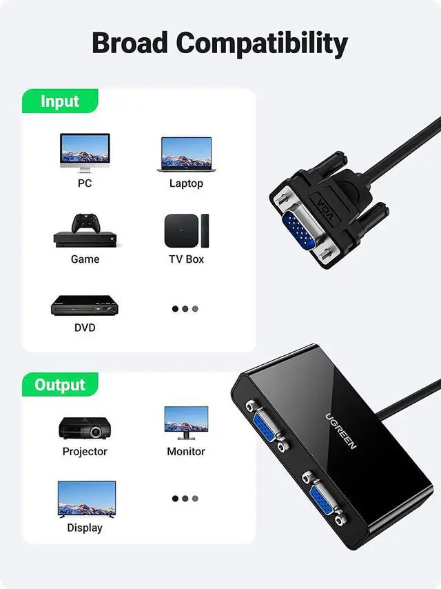HowitWorks: This VGA splitter enables you to connect a VGA input device(laptop, PC, set-top box, blue-ray, etc.) to two VGA output display screen devices. And it only can deliver the same image. (TVs, displays, projectors, etc.), supports 82ft long-distance transmission. Supports resolution up to 1920x1440 @60Hz, compatible with lower resolution, such as 1080P, 1600x1200, 1680x1050, 1066x900, etc. Supports VGA, SVGA, XVGA, UXGA. Bandwidth up to 250Mhz.