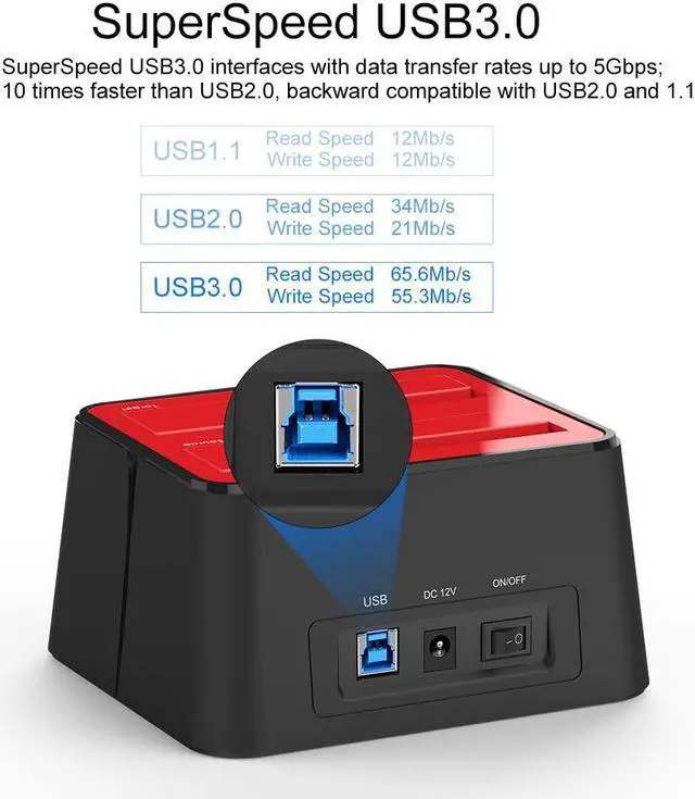 Super Speed and Support 2 8TB Super speed USB 3.0 interfaces with data transfer rates up to 5Gbps, 10 times faster than the traditional USB 2.0; This hdd docking station supports all 2.5 ''/ 3.5 '' SATA I, SATA II, SATA III HDD SSD, Support 2 8TB hard drivers with UASP protocol Improve Your Use Experience No drivers needed, Tool-free installation on Windows Vista / 7 / 8 / 10, Mac OS X 10.2 to 10.10; This hdd duplicator is hot-swappable; plug and play Perfect Power Design Meet Your Requirement The hdd dock is built-in power control switch; Highly efficient (12V, 3A), stable and reliable DC power source guarantees a steady supply of energy; Automatic sleep mode after 30 minutes of inactivity saves energy.