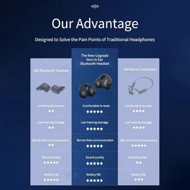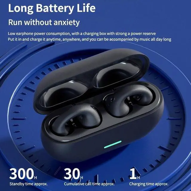 Ear Clip Bone Conduction Headphones Be safe, present, and aware. Introducing a new open-ear headphone that let you listen to music and sound, but also hear the world around you. Support clear call quality, Supports technology to reduce wind noise and environmental noise, making calls clearer. Lightweight & Stable Fit Made of skin-friendly soft silicone material that keeps running relaxed, the open ear design helps you achieve true painlessly and harmlessly as the earphone does not need to plug into the ear canal. With an ergonomic surround and streamlined sinking design, the sports Bluetooth headphones can keep on the ear when running, dancing, or wearing glasses.
