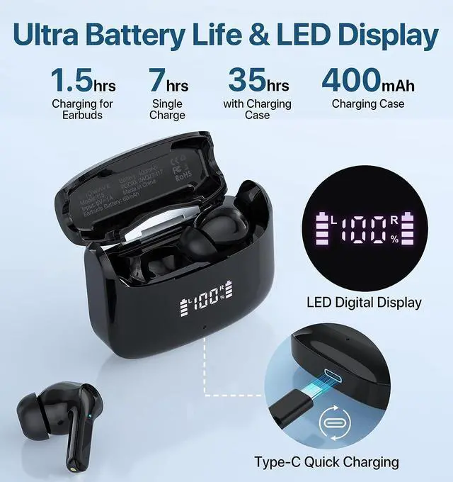 Charging Case: Stay in control with our true wireless earbuds that come with a built-in LED power display and a 400mAh battery capacity charging case. Easily monitor the battery level of your charging case and the status of your earbuds. With the charging case, you can enjoy up to 5 additional charges, extending the battery life of your earbuds. On a single charge of 1.5 hours, the earbuds themselves provide an impressive 7 hours of playtime. IPX7 Waterproof & HiFi Stereo Sound: Take your music anywhere without worry. These earphones are equipped with an IPX7 waterproof rating, ensuring resistance to sweat and light rain. Whether you're running, working out, or engaged in any outdoor activities, our Bluetooth headphones will keep up with you. The built-in 10mm speaker driver delivers deep bass and crystal-clear treble, allowing you to indulge in an immersive music and calling experience.