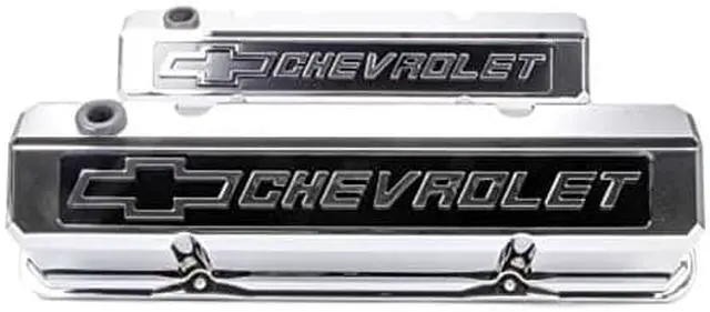 • Valve Cover - Slant-Edge - Tall - Baffled - Breather Hole - Raised Chevrolet Bowtie Logo - Aluminum - Chrome - Small Block Chevy - Pair