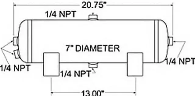 This Firestone air tank provides a source of compressed air for an air spring system. Tank has 3-gallon capacity, (3) 1/4 in. NPT ports and (1) 1/8 port. Tank is enamel coated, tested to be SAE J10 compliant and capable of 150 psi. Features: Provides compressed air source for an air helper spring system Allows for faster inflation of air springs Holds 3 gallons of compressed air Includes (3) 1/4 in. and (1) 1/8 in. NPT ports Steel tank with brass fittings Resists corrosion with internal and external enamel coating Is SAE J10 compliant Operates at up to 150 psi of maximum pressure Specs: Tank dimensions: 20.75 in. long x 7 in. diameter Tank capacity: 3 gallons Inflation ports: 1/4 in. and 1/8 in. NPT PSI: Maximum of 150 2-Year limited warranty