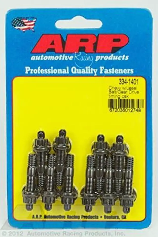 ARPs timing cover bolts are available in both polished stainless steel or black oxide finish chrome moly. You also can choose between standard hex head bolts or compact 12-point fasteners. Also available as part of ARPs complete Engine & Accessory kits.Studs are preferred by many Pro engine builders because they eliminate the chance of pinching gaskets and contribute to easier engine assembly. You will note that ARP studs feature a special bullet nose to guide the nut accurately into place. Available in black oxide finish 8740 chrome moly or polished stainless steel with hex or 12-point nuts. Jesel Belt/Gear Drive Stud Kit Hex Head Material Black Oxide