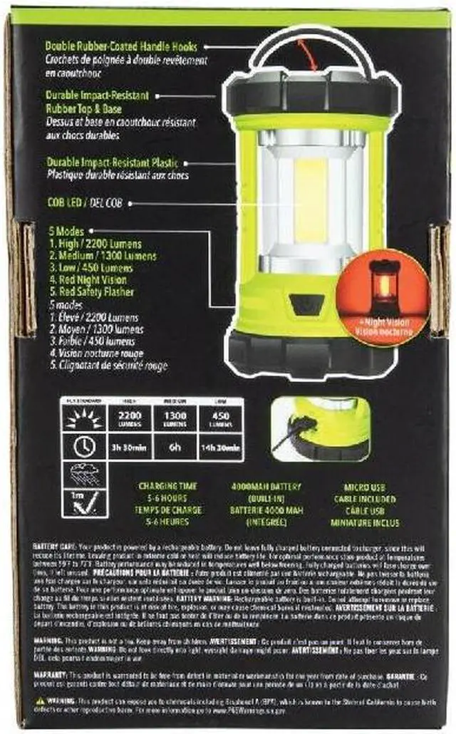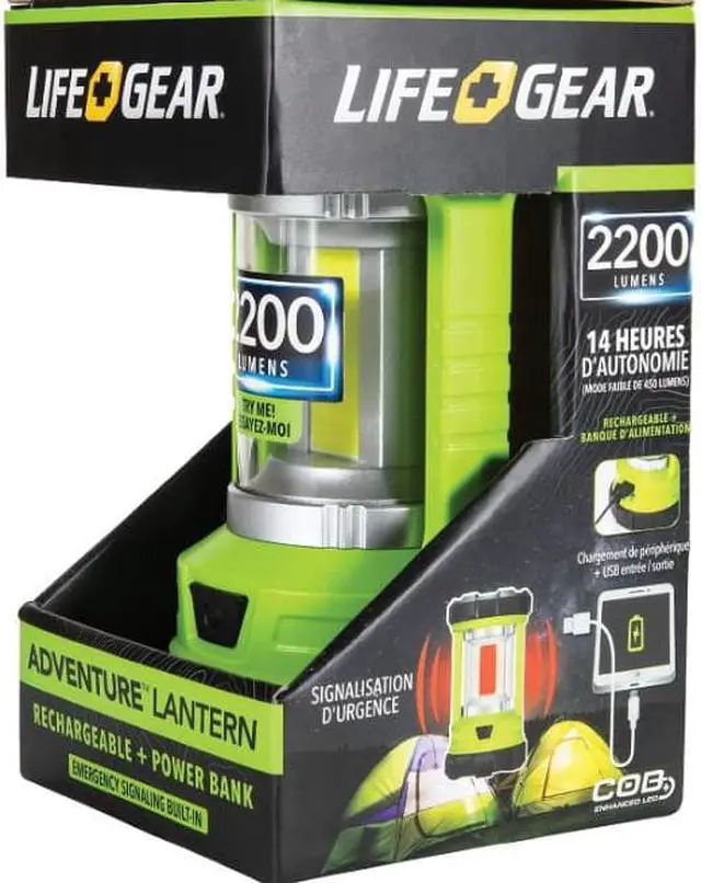 The lantern has high, medium, and low modes as well as red safety solid and flash modes.The Life+Gear USB Rechargeable Lantern and Powerbank is a durable, impact- and water- resistant design producing 2,200 lumens. The lantern has different light modes allowing you to control the run time and brightness.
