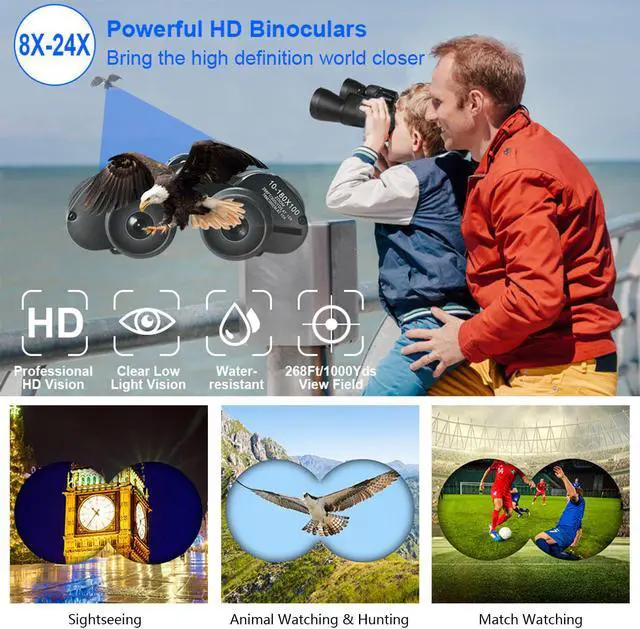 *Portable and Powerful Binocular*:Features Full 8~ 24 x magnification for bringing object 8~ 24 times closer,50mm-diameter object lens for allowing more light to come through(more clear,even low light condition),22mm-diameter eye lens for larger observation range and comfortable view. Owning compact portable size(Full-size:20 x 18 x 6cm/7.87 x 7.08 x 2.36 inches / Net Heavy Weight:1.74 lbs),with a rugged rubber exterior for comfortable grip and durable use.
