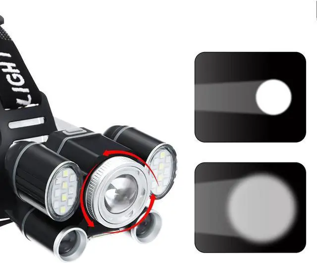 Modes: 5 modes ( 2xT6 strong light - P50 strong light - 2xT6 strong light+P50 strong light - COB strong light - 2xT6 strong light+P50 strong light+COB strong light+LED white light)