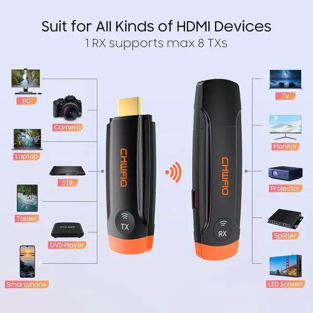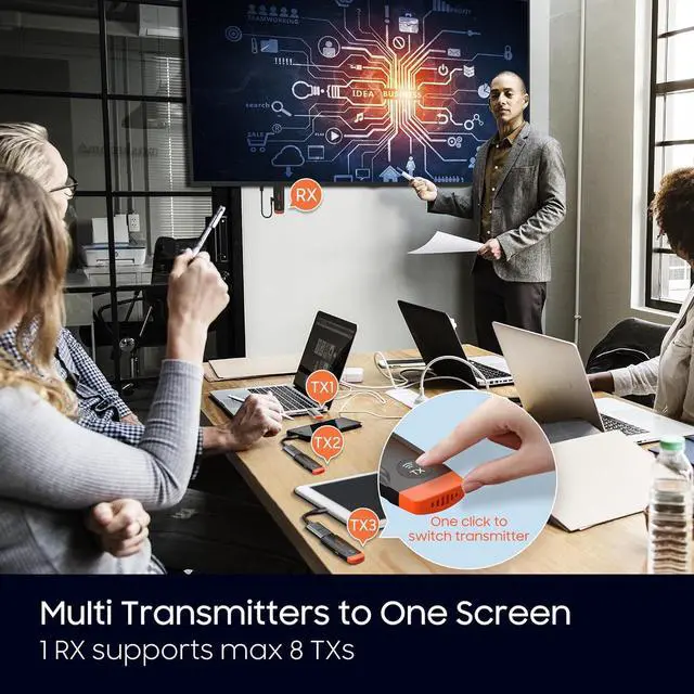 Multi TXs to One RX, One - Click SwitchThe Wireless HDMI Transmitter Receiver comes with 2 types of HDMI adapters for various signal sources, allowing 8 TXs to be bound to 1 RX with one - click switching between sources. It's perfect for offices, churches, home theaters, and professional presentations