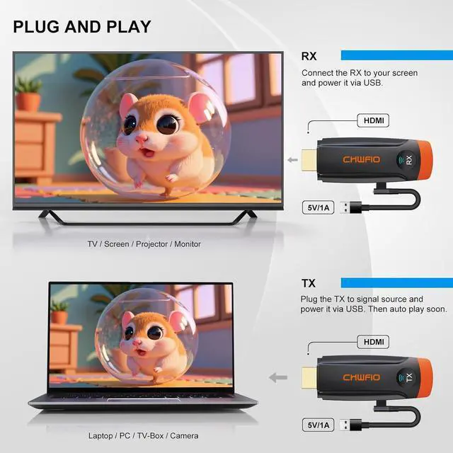 Type-C Compatibility Note Works with tablets/smartphones featuring USB-C 3.1 Gen 1 or Thunderbolt 3 with DP alt mode (for video output). Both transmitter/receiver require 5V/1-2A power supply (adapters not included) to ensure stable, uninterrupted wireless streaming(Does not include Type C to HDMI cable/adapter)