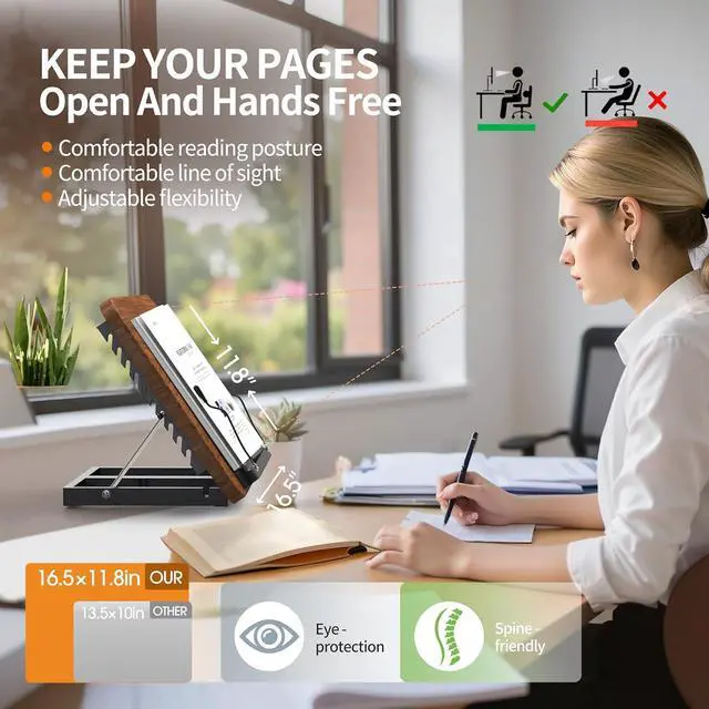 Wooden Panel & Book Clip Design: The 0.5 -inch thick wooden panel ( 16.5" x 11.8" ) offers more space than most standing laptop stands, supporting a variety of devices. Raised 2-inch edges prevent slipping for added stability. The built-in book clip secures books or documents, keeping your hands free for improved comfort.