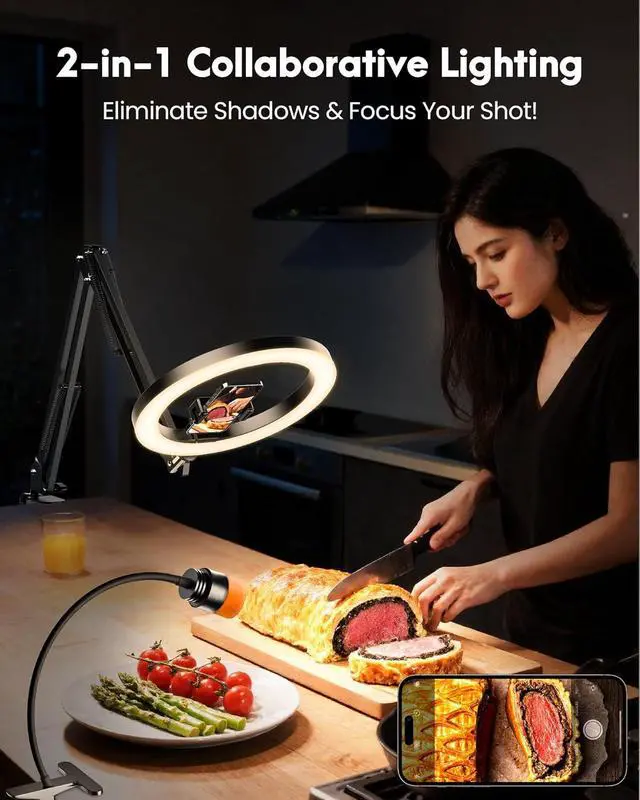 Eliminate Harsh Shadows: Unlike traditional overhead lights that cause shadows, this ring right for desk places your phone in the center of the ring, eliminating light blockage. Ideal as an overhead camera mount for recording, filming, or live streaming. Comes with a bluetooth remote, allowing hands-free video starts and selfie shotsno blur, no shake.