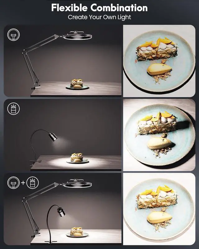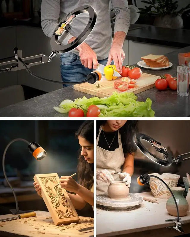 Sturdy and Stable Structure: The ring light with tripod for iPhone includes a reinforced aluminum alloy stand and dual-spring arm that supports up to 3.3 lbs. The clamp attaches securely to surfaces up to 2.3 thick. The spotlight features a 360° adjustable gooseneckeasily aim your lights without moving the base. Perfect for phone stand for recording, camera holder, or lighting equipment for videos.