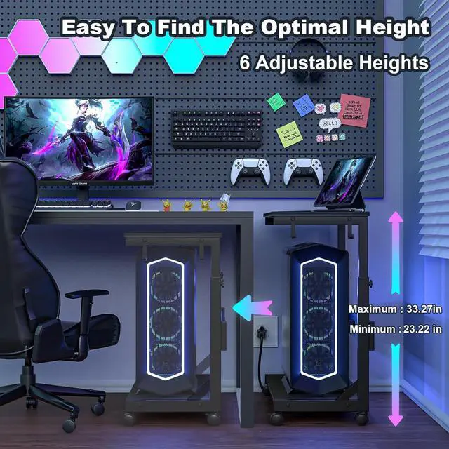 • Height Adjustable Pc Tower Stand: Features unique manual height adjustment ranging from 23.23"-33.27" to speed up heat dissipation and improve overall computer performance, overall dimensions 25.19 inches long, 13.78 inches wide, Allows you to store the tower under or next to a desk, Supports most computer towers on the market including full-tower ATX case