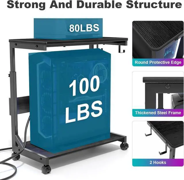 • Pc Tower Stand With Charging Station: This Mobile PC Standing with dual 120V/12A outlets and dual USB ports can power your laptop, smartphone, printer, tablet or any electronic device. Great for keeping an organized workspace. Plus, the PC Tower Rack doubles as a side table to provide additional power for your desk lamp