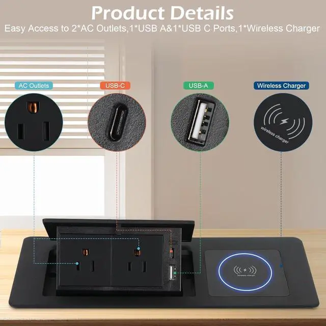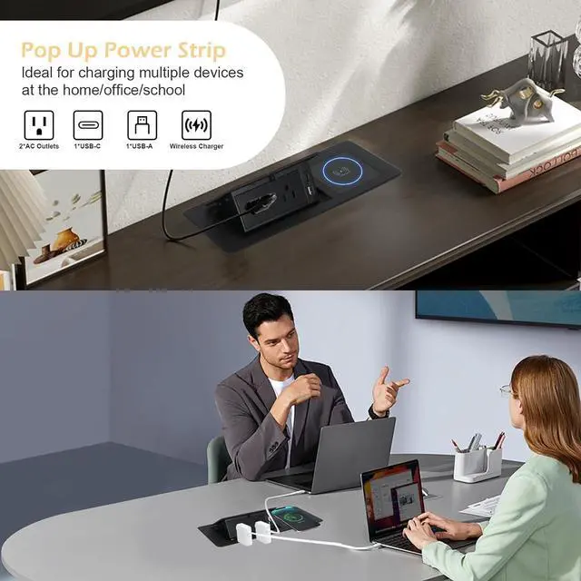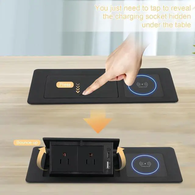 Table Pop Up Outlet, an automatic pop-up strip designed for the center of your countertop, offers a recessed power strip solution complete with a 15W wireless charger, USB-A and USB-C ports, along with two AC outlets. This convenient and sleek device comes with a 5.9 -foot cord, making it perfect for use in conference desks, office spaces, or kitchen areas. The black-wireless version ensures a modern and stylish addition to any setting, providing all the charging options you need in one compact unit.