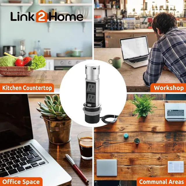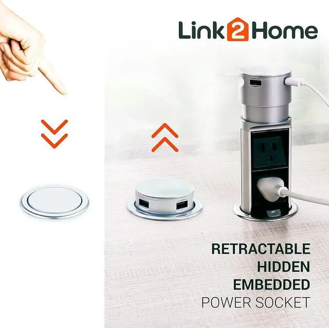 Link2Home Space Saver Pop Up-Outlet, 2 Power Outlets, 2 USB Ports 2.4 Amp, Overload Protection, Splash Resistant EM-PU-200E