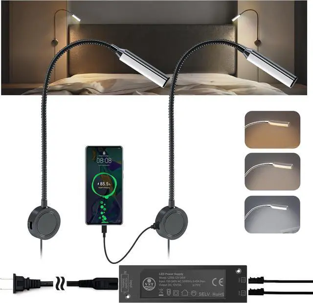 Night Light & USB and Type C Dual Output The bedside reading lamp 5V 1.25A Standard USB output provides for charging your mobile devices: mobile phones, pads, and kindle charging. The Bedside Headboard Lights extra night light function, the light is soft, not dazzling, makes you a more choice.