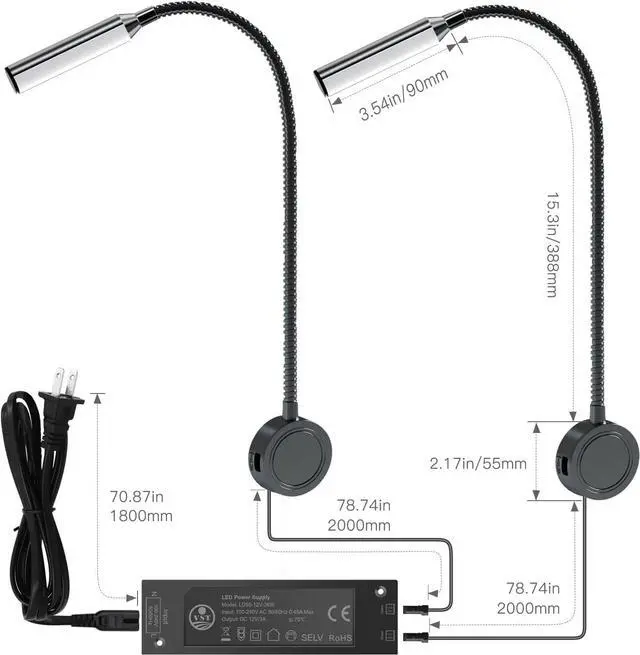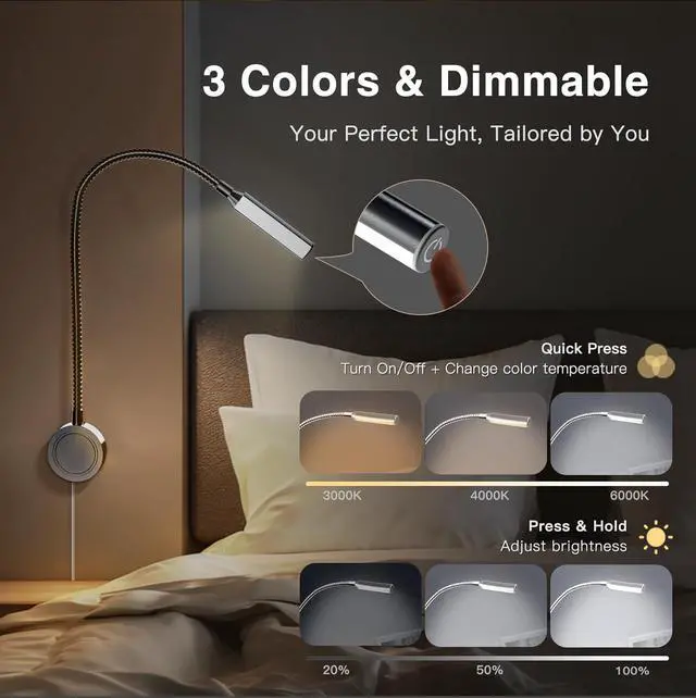 Flexible Gooseneck & Touch ControlThe wall-mounted Reading Light Gooseneck head can rotate 360°, allowing it to be adjusted and directed lighting, providing flexibility and convenience. With touch dimmer switch and two timers, this wall-mounted reading lamp offers easy control.