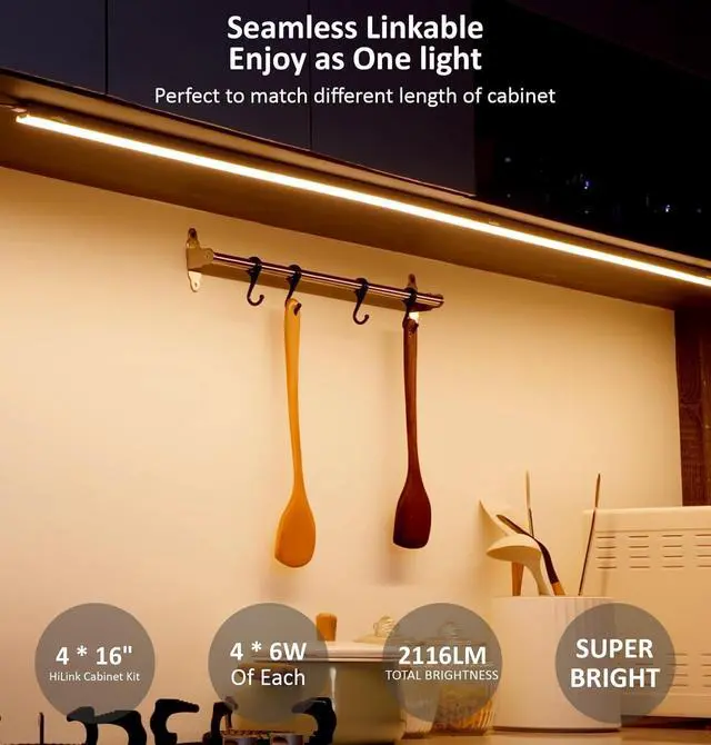 Linkable led cabinet lights: Can be seamless linked in a split or continuous configuration. All the links looks like one under the cabinet light. Or linked by a 2 feet Junctor, flexible to be used for different length of Cabinet, Closet, Bookcase, Shelves, Display lights, Pantry lights, Plug in vanity light, hidden lights. Also comes in 12in, 16in, 24in, 32in