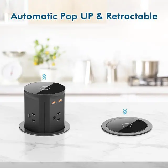 Widely Use Pop Up Outlets - The countertop outlet is perfect for kitchen islandgranite counter topoutside serving tablesofa tablestorage cabinet, RV countertop, office, conference, shops etc. (pop up power strip is splash resistant (IP4 waterproof), If you accidentally spill water, wipe off the water on the surface and you can use it normally)