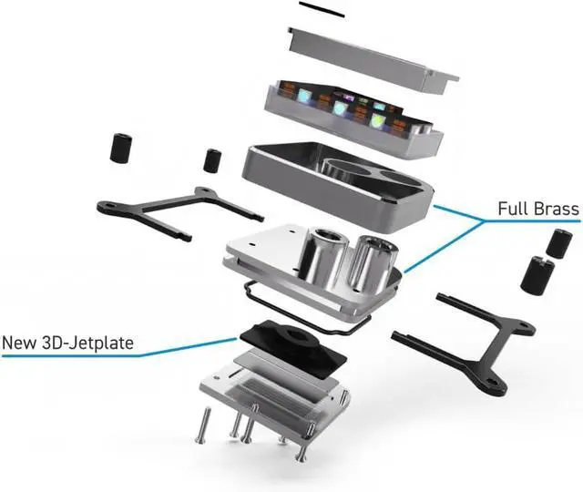 With the Core 1, Alphacool presents a new generation of CPu water cooling. The latest desktop processors are constantly becoming more powerful, but they also produce more and more waste heat. The Core 1 reliably solves this problem with the help of its completely newly developed 3D jet plate, which is also used in industry. The CPu water cooler, made entirely of metal, not only impresses with its elegant appearance, but also has a new mounting system that simplifies installation. New mounting system The mounting system has also been revised. Compared to the previous Alphacool models, it requires fewer screws. First, the backplate (Intel) is pre-assembled with four spacers. Then the thermal paste is applied to the CPu. The appropriate mounting frame is then placed on the CPu cooler and fastened to the spacers with four nuts. Core Design The functional and elegant design is a central element of Alphacool's Core series. The nickel-plated connections and the subtle contour line stand out from the high-quality brass housing. The rounded corners give the overall picture the perfect touch. The Core 1 is available in different color designs, as well as in subtly illuminated aRGB Aurora models.