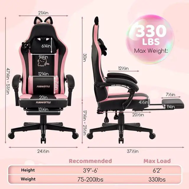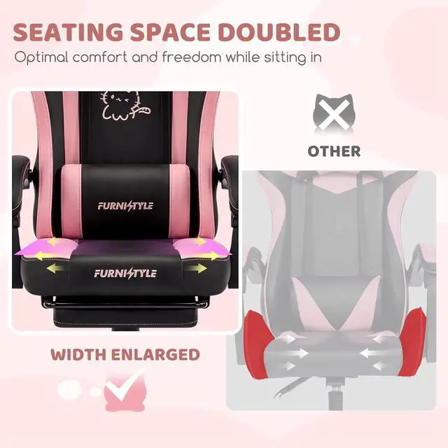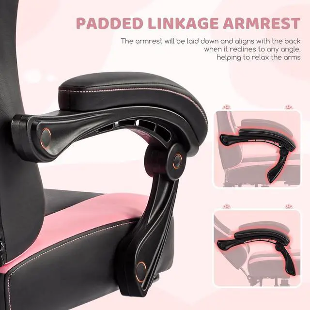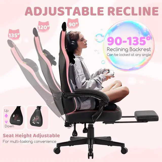 ERGONOMIC SUPPORT DESIGNED FOR HER: Equipped with elastic headrest and adjustable latex lumbar pillow, this plus size gaming desk chair's arched backrest molds to your spines natural curve for full-body support and proper posture and then safely reclines from 90° to 135° backwards. Padded linked armrests will move in sync with the reclining backrest to support your arms at every angle while the retractable footrest lets you kick back and relax during breaks or napsideal for girls and women who spend hours seated.