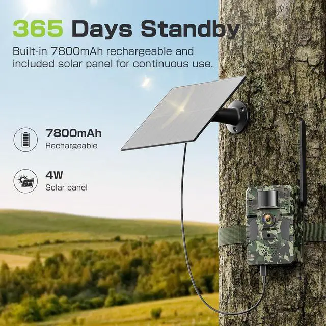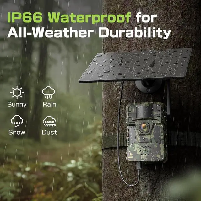 Sustainable Power and IP66 Rugged DurabilityThe solar trail camera includes a 4W solar panel and a 7800mAh rechargeable, forming a dual power supply system offers a long-lasting power solution. IP66 Waterproof trail cameras built to withstand rain, dust, and extreme weather, the trail camera is reliable year-round, perfect for forests, farms, and outdoor surveillance.