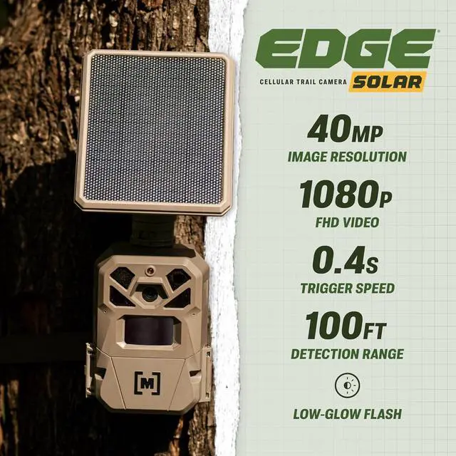 Never worry about battery changes again with the EDGE SOLARMoultries most advanced cellular trail camera built for long-term, maintenance-free operation. Its integrated adjustable solar panel is the largest in its class, powering a built-in rechargeable battery pack designed to last all season long. Capture stunning 40MP photos and 1080p FHD videos with sound using a low-glow infrared flash that delivers an extended 100-foot detection and illumination rangeperfect for both wildlife monitoring and security purposes. A rapid 0.4 -second trigger speed ensures fast capture performance even in high-movement zones. With true remote functionality, you can request photos or videos on demand and manage all settings directly from the Moultrie App. Theres no need for an SD cardeverything is stored and accessed in the cloud. The EDGE SOLAR also features a nationwide multi-carrier LTE module that automatically connects to the strongest signal, no matter your location. Included with each unit is the EASY AIM MOUNT and heavy-duty strap for easy setup and secure installation. From solar efficiency to connected intelligence, the EDGE SOLAR redefines low-maintenance performance in the field.