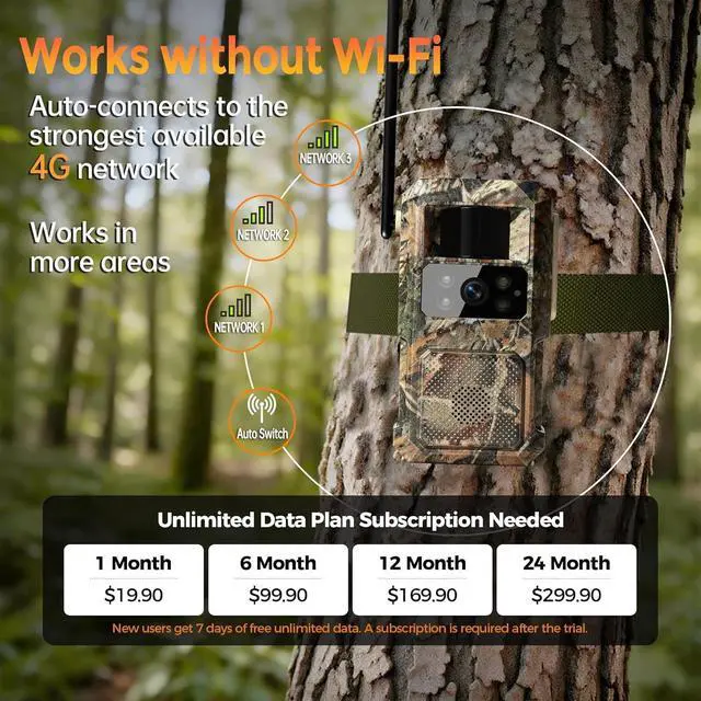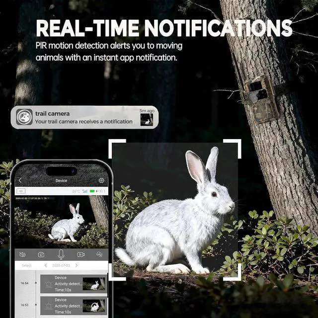[Ultra-Fast 0.2 s Trigger & Smart Detection] With an adjustable PIR sensor and 0.2 -second trigger speed, this cellular trail camera instantly captures motion in photos and videos. Receive real-time alerts via the Ucon app, and view, download, or playback footage directly on your phone.