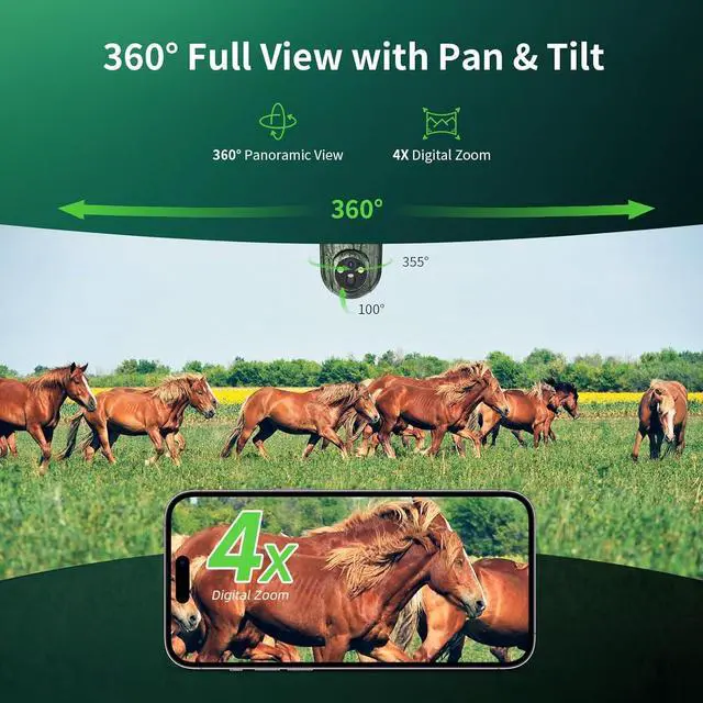 360° Wide-Area ViewEngineered for all-round coverage, the cellular game cameras support 355° horizontal pan and 100° vertical tilt, delivering near-complete 360° visibility with no blind spots. Perfect for covering wide outdoor spaces, ensuring you never miss important activity