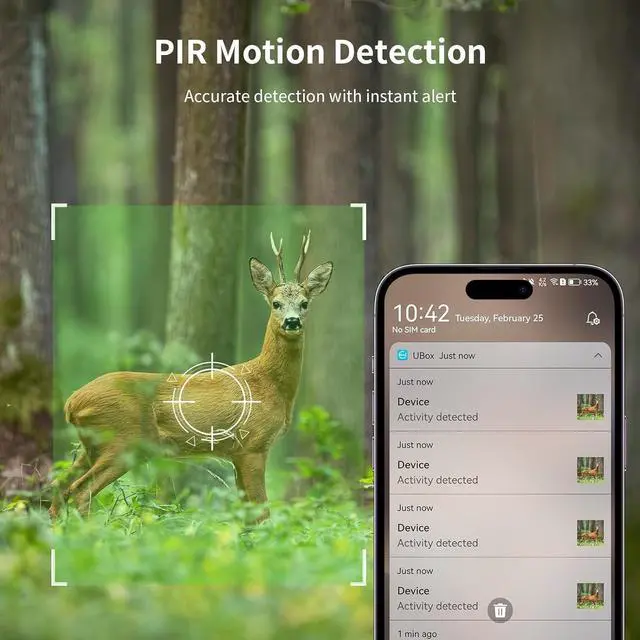 Instant Motion Alerts & Two-Way TalkEquipped with a highly sensitive PIR sensor, the deer camera detects motion in just 0.2 s and instantly sends alerts to your phone, ensuring you never miss a moment. With Two-Way Talk, you can communicate in real timewhether warning off intruders, guiding visitors, or or observing wildlifeall directly through the UBox app
